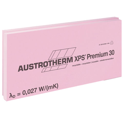 Druckfeste Wärmedämmplatte aus extrudiertem Polystyrolhartschaum mit glatter Oberfläche und Stufenfalz. Entspricht Produktart XPS-G 30 gemäß ÖNORM B 6000.